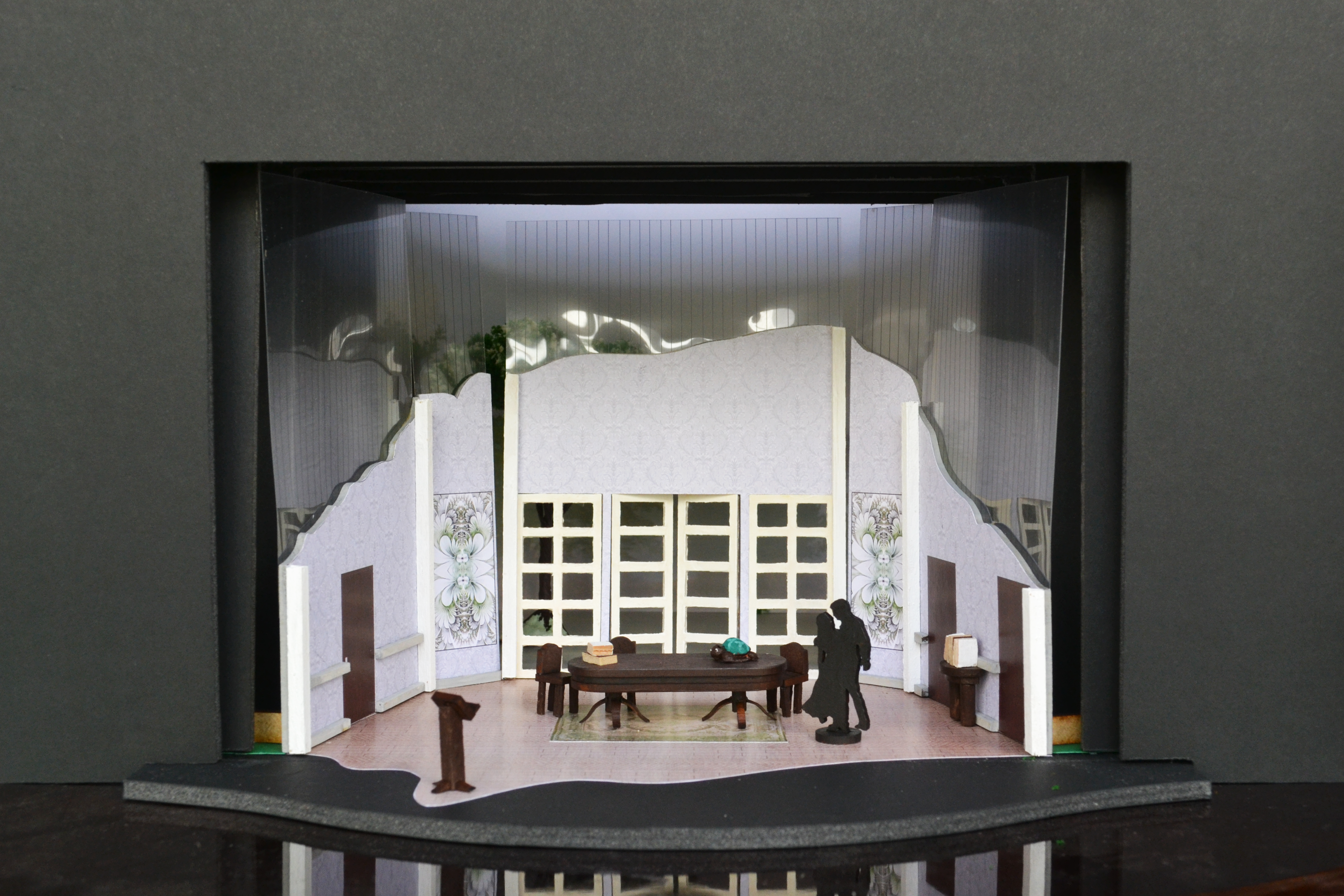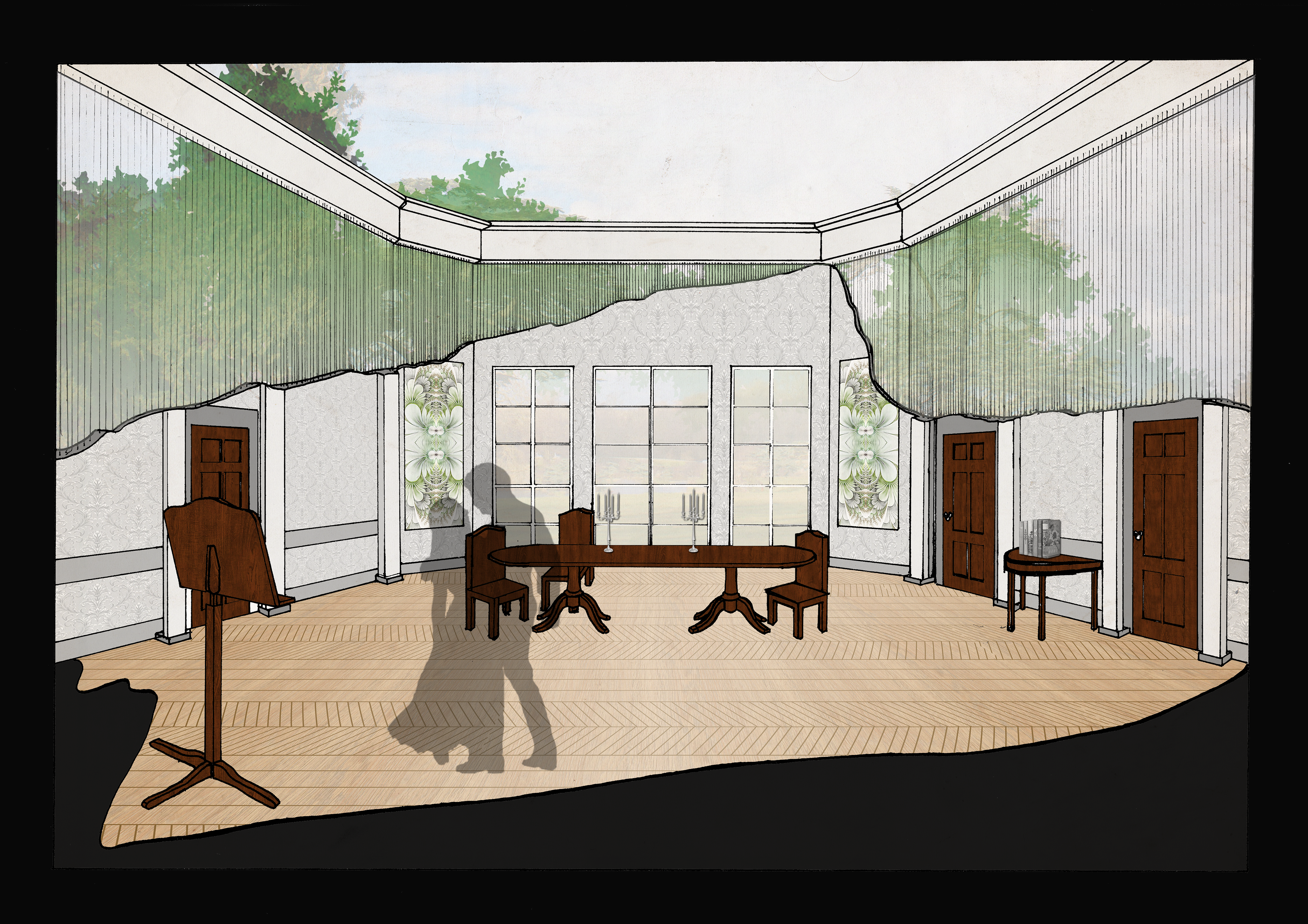 A passion project, a design for Tom Stoppard's Arcadia. Emphasizing the outside's presence inside, and revealing structures within.